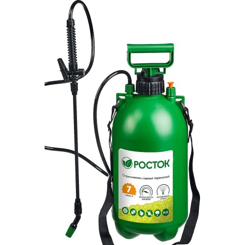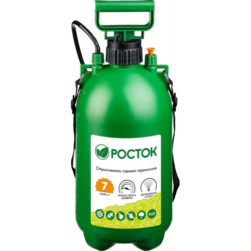 Опрыскиватель садовый РОСТОК 425117, предназначен для равномерного качественного опрыскивания и удобрения комнатных и садовых растений. Армирование шланга, фиксатор полива, ремень для переноски на плече, клапан сброса давления. Объем - 7 литров.