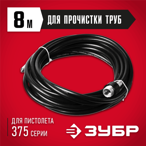 Шланг для прочистки труб ЗУБР 70414-375-8, предназначен для прочистки труб струей воды под давлением. Универсален для всех моделей моек ЗУБР. Мощные струи вперед для очистки стенок. Быстрое продвижение вперед благодаря реактивной струе.