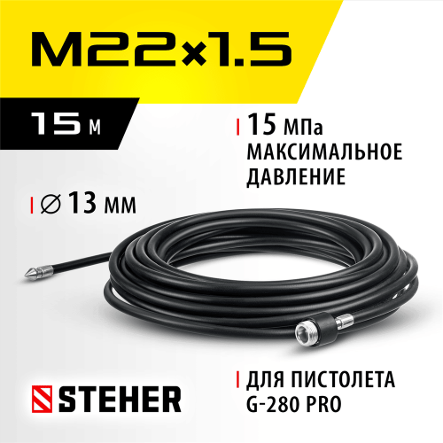 Шланг для прочистки труб STEHER 75414-280-15, предназначен для прочистки труб (сливных, дождевых, канализационных) от загрязнений путем подачи струй высокого давления. Мощные струи сбивают грязь со стенок трубы с одновременным продвижением в канале. Надежное резьбовое соединение. Шланг имеет стекловолоконное армирование. Подходит для моек HPW-180B, HPW-200B, HPW-240B.