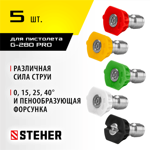 Комплект насадок STEHER 75408-280-5, предназначен для очистки различных поверхностей путем формирования струй разного давления. Полная совместимость с пистолетом STEHER G-280 PRO 75410-280. 4 насадки с разными углами распыления/давлением струи для различных работ. Насадка с минимальным давлением для нанесения моющего средства. Быстросъемное соединение. Подходит для моек HPW-180B, HPW-200B, HPW-240B.