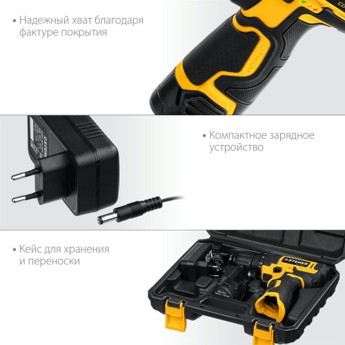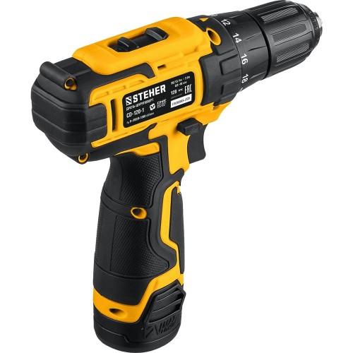 Аккумуляторная дрель шуруповерт STEHER CD-120-1, предназначена для сверления отверстий в различных материалах (при установке сверла), а также для вкручивания/выкручивания шурупов, саморезов и винтов (при установке соответствующих бит). Компактный аккумуляторный шуруповерт с удобной эргономикой для комфортной работы. Аккумулятор универсальной системы Li-Ion V1 12 В повышенной емкости 2.0 А*ч позволяет инструменту выдавать более высокие характеристики. Высокий крутящий момент при широком диапазоне оборотов благодаря конструкции редуктора. Бесключевой одномуфтовый патрон для максимальной простоты и скорости замены расходного инструмента. Двухскоростной планетарный редуктор позволяет как заворачивать с большим крутящим моментом, так и сверлить на высоких оборотах. Широкий диапазон регулировки крутящего момента превращает изделие в универсальный инструмент: от аккуратного закручивания маленьких винтиков до заворачивания крупных саморезов. Возможность быстрой смены биты благодаря блокировке шпинделя.