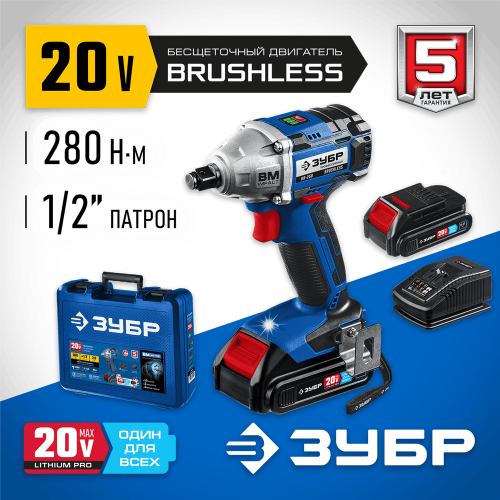 ЗУБР 20В, 2 АКБ, в кейсе, бесщеточный, аккумуляторный гайковерт GB-250-22 Профессионал