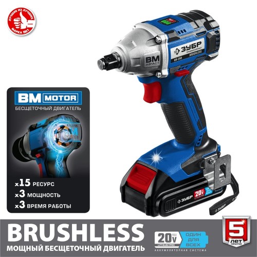 Гайковерт Зубр GB-250-22, предназначен для заворачивания/отворачивания крепежа (при сборке/разборке металлических конструкций, снятии/установке колес автомобиля и т.д.). Незаменимый инструмент для крупного крепежа. Значительный крутящий момент для наиболее сложных работ. Ударная функция позволяет заворачивать крепеж большого диаметра и отворачивать приржавевшие метизы. Бесщеточный двигатель Brushless обладает целым рядом преимуществ по сравнению с обычным щеточным двигателем: высокий крутящий момент – в 2 раза выше, чем у аналогичного щеточного двигателя; высокий КПД благодаря максимально эффективному преобразованию электромагнитной энергии в механическую (ввиду отсутствия перекоммутаций). Низкое энергопотребление, вследствие чего изделие работает до 4 раз дольше на одном заряде батареи. Высокая степень защиты двигателя благодаря интеллектуальному управлению. Контроллер двигателя позволяет гибко регулировать крутящий момент и поддерживать его на максимальном уровне в широком диапазоне оборотов.