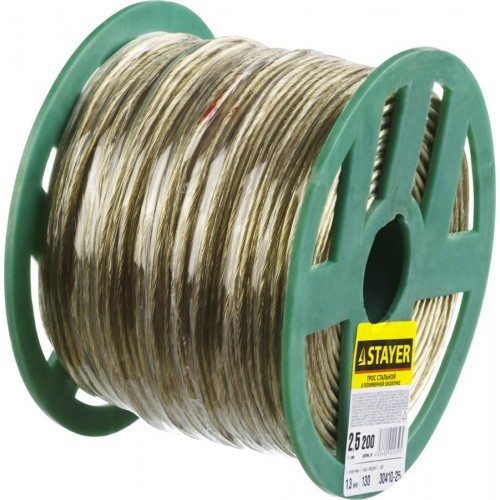 Стальные тросы Stayer 30410-25 предназначены для использования в быту, садоводстве, при проведении строительных работ, перевозке грузов и т.п.. Используются в быту, садоводстве, при проведении строительных работ, а также в качестве подвесок и растяжек для установки антенн, прокладки уличных кабелей и др. Данные тросы не предназначены для подъема и перемещения грузов. Стальные тросы STAYER в полимерной оболочке изготовлены из высококачественных материалов и применяются во многих сферах жизнедеятельности человека.