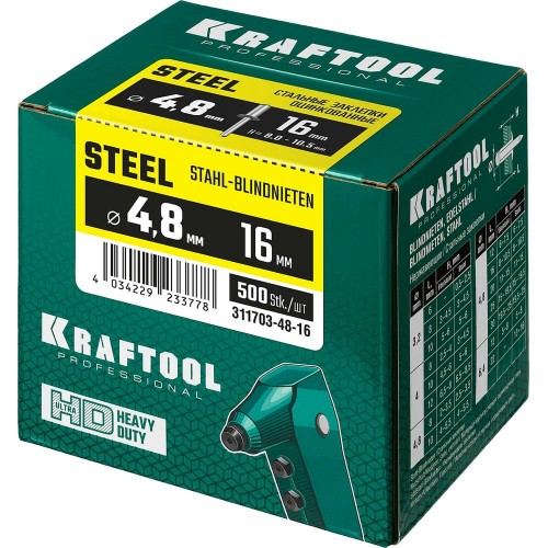 Заклепки стальные KRAFTOOL 311703-48-16, предназначены для получения неразъемного соединения из двух или более слоев материалов с помощью заклепочника.