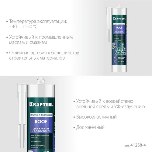 Кровельный силиконовый герметик 300мл Kraftool 41258-4 - долговечный силиконовый материал широкого спектра применения для выполнения профессиональных монтажных работ, например: герметизации соединени при проведении кровельных работ внутри и снаружи помещения, стыках водостока, герметизации швов в кровле. Состав изделия позволяет герметику сохранять свои эксплуатационные характеристики под солнечными лучами, в дождь и в холод. Герметик быстро затвердевает под действием влажности воздухв, обладает высокой эластичностью и адгезией к большинству материалов (металлы, стекло, древесина, керамика, пластик, окрашенные поверхности). Отличается устойчивостью к влаге, атмосферным воздействиям и химическим веществам. Температура нанесения: от +5 до +40 °С, температура эксплуатации от -40 до +80 °С