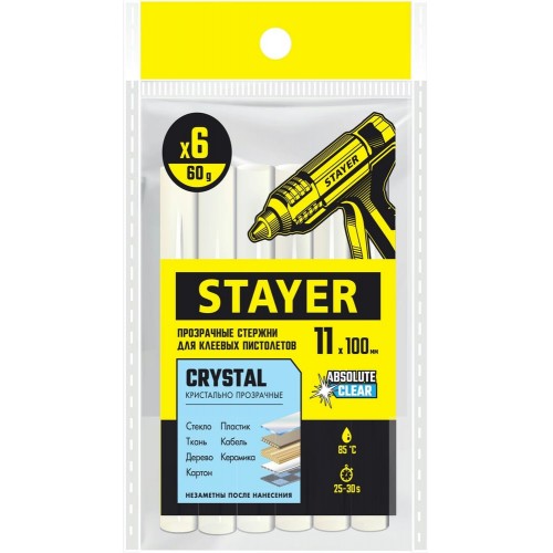 Клеевые стержни STAYER 0682-H6, предназначены для склеивания стекла, ткани, ПВХ-пластика, электроаппаратуры, металла. Используются в местах крепления материалов, где применение гвоздей, скоб и другого крепежа невозможно или нежелательно.