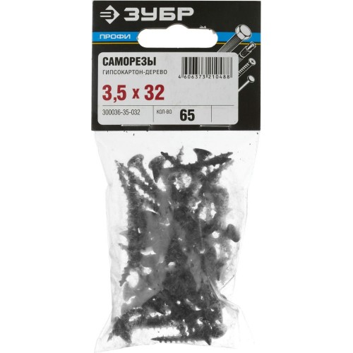 Саморезы гипсокартон-дерево ЗУБР 300036-35-032, предназначены для крепления гипсокартона к деревянной обрешетке, не допуская крошение волокнистой структуры дерева. Саморезы легко вкручиваются обычным шуруповертом или отверткой с крестообразным шлицем PH2 (DIN). Предварительное сверление в скрепляемых материалах не требуется. Фосфатированное покрытие обеспечивает защиту от коррозии. Широко применяются при выполнении бытового ремонта, сборке и установке различных конструкций. Саморезы для гипсокартона изготовлены из стального прутка с высоким содержанием углерода. Контроль геометрией самореза начинается с калибровки прутка и заканчивается тщательной проверкой размеров готового изделия. Нормативная твердость стали достигается термической обработкой. Поверхностная твердость 450-720HV, твердость в сердцевине 290-450HV.