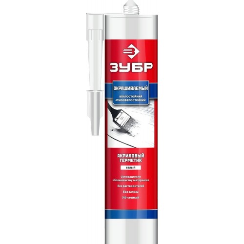 Герметик универсальный, белый, акриловый ЗУБР 41231-0, предназначен для внутренних работ при строительстве, ремонте и в быту. Профессиональный акриловый герметик широкого применения. Отличная адгезия к ПВХ, бетону, кирпичу, стеклу, металлу, штукатурке, цементу, дереву, но не к полиэтилену и тефлону. Пригоден для окрашивания. Не содержит растворителей. Устойчив к воздействию внешней среды, УФ-излучению. Водостоек, но не рекомендуется использовать в местах, имеющих постоянный контакт с водой.