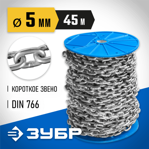Цепь такелажная короткозвенная DIN 766 ЗУБР 4-304050-05, предназначена для использования в бытовых нуждах и при проведении строительных работ в качестве подвесок, растяжек, для закрепления грузов. Цепи обладают отличной гибкостью, благодаря чему они находят широкое применение в строительстве и быту. Под воздействием большой нагрузки происходит незначительное удлинение цепи. Короткозвенные цепи имеют большую свободу изменения формы в пределах одного звена, что позволяет легко закрепить цепь в нужном месте или создать крепежную петлю. Не используются в грузоподъемных механизмах, для перемещения грузов и при такелажных работах. Цинковое покрытие обеспечивает устойчивость цепей к неблагоприятному воздействию окружающей среды.