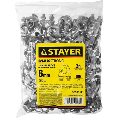 Зажимы STAYER 30535-06, предназначены для изготовления петель на концах троса, используется совместно с коушем. Рекомендуемое расстояние между зажимами равно шестикратному диаметру троса. Минимальное количество зажимов - 3 шт. Такелажные изделия STAYER изготовлены в соответствии с действующими стандартами.