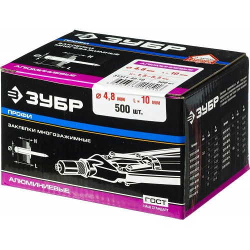 ЗУБР 4.8 x 10 мм, 500 шт., заклепки многозажимные, алюминиевые 31311-48-10 Профессионал