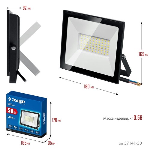 Прожектор светодиодный ЗУБР 57141-50, предназначен для наружного освещения на открытых строительных и производственных площадках. Используется для подсветки объектов: витрин, экспозиций, рекламных стендов и щитов, фасадов зданий и т.п. Прожектор может также применяться для внутреннего освещения больших помещений: залов, спортивных помещений, автостоянок. Благодаря ударопрочному корпусу, термостойкому стеклу и высокому классу электрозащиты можно использовать на улице в любую погоду. Широкий диапазон рабочих температур: -45С+50С. Порошковая окраска обеспечивает защиту от коррозии. Герметичная пыле-влагозащищенная конструкция IP65. Срок службы светодиодов 30 000 часов. Низкое энергопотребление. Высокая энергоэффективность.