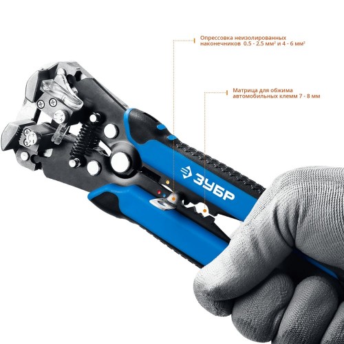 - Обжим изолированных наконечников 0,5-6 мм², неизолированных наконечников 0.5-2.5, 4-6 мм.