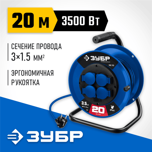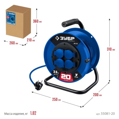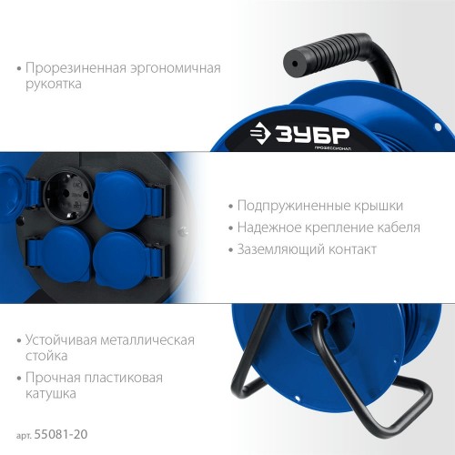 Силовой удлинитель на катушке ЗУБР 55081-20_z01, применяется для подключения электрических приборов к сети, предназначен для использования, как в помещении, так и на улице. Катушка позволяет легко сматывать и разматывать кабель, обеспечивая мобильное перемещение и компактное хранение. Заземляющая жила обеспечивает повышенную электробезопасность. Надежное крепление кабеля к клеммам, предотвращает нагрев и искрение. Специальный воротник, защищающий шнур от перегибов и истирания.