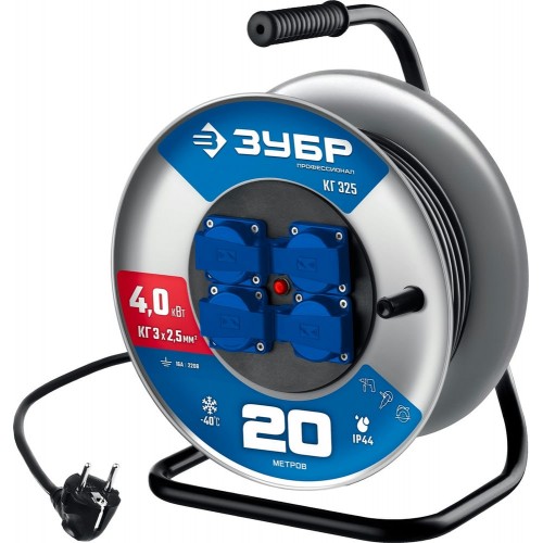 Силовой удлинитель на катушке ЗУБР 55079-20_z01, применяется для подключения электрических приборов к сети, предназначен для использования, как в помещении, так и на улице.