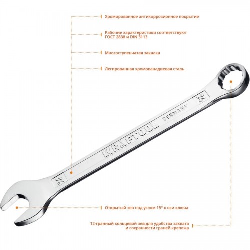 Комбинированный гаечный ключ KRAFTOOL 27079-24_z01, применяется для работ с шестигранным крепежом. Ключ изготовлен по современной технологии методом холодной штамповки. Качественная хромованадиевая сталь. Хромированное покрытие. Закалка для оптимального баланса твердости и прочности. Высокая стойкость к истиранию рабочих граней.