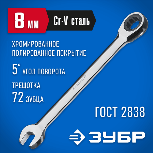 Комбинированный гаечный ключ ЗУБР 27074-08_z01, применяется для работ с шестигранным крепежом. Благодаря правильному подбору материала и параметров технологического процесса выдерживает высокие нагрузки и стоек к истиранию рабочих граней. Трещоточный механизм. Изготовлен из высококачественной хромованадиевой стали с многоступенчатой закалкой для увеличения ресурса ключей, а также обладает надежным хромированным покрытием для защиты от коррозии.