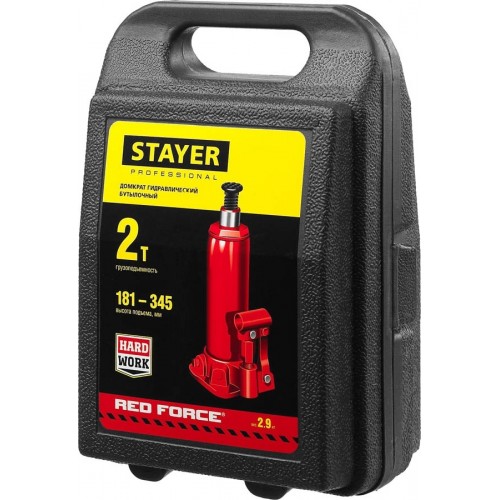 Домкрат гидравлический бутылочный STAYER 43160-2-K_z01, используется для обслуживания автомобилей или при работах связанных с ремонтом фундаментов. Компактность, небольшой вес и высокая грузоподъемность позволяет использовать домкрат при проведении ремонтно-строительных работах. Компактный. Высокая грузоподъемность.