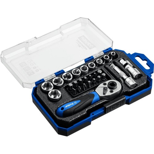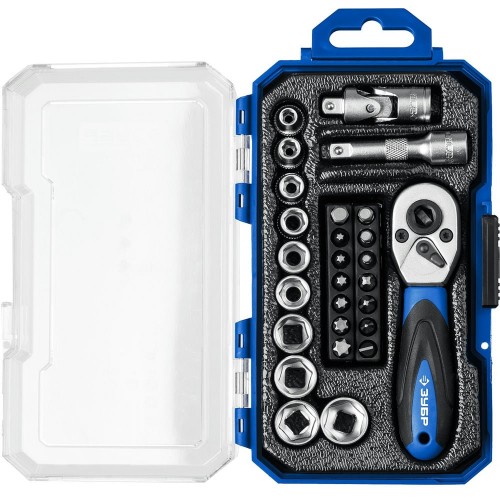 Универсальный набор инструментов ЗУБР 27642-H27_z01, предназначен для монтажа и демонтажа резьбовых соединений при ремонте автомобилей и других изделий. Изготовлены из хромованадиевой стали для достижения оптимального баланса прочности и твердости. Хроматированное покрытие для защиты от коррозии.