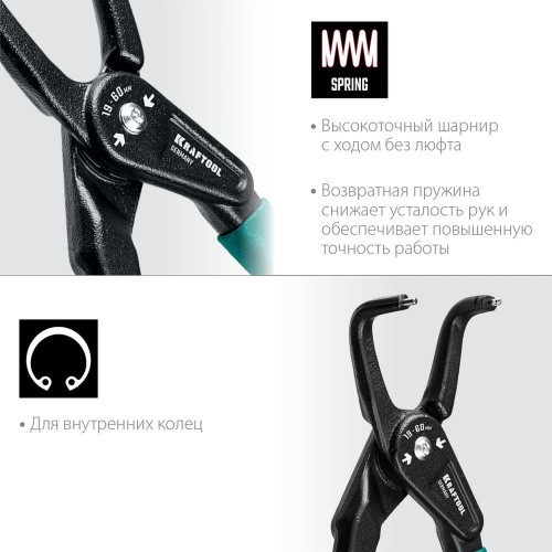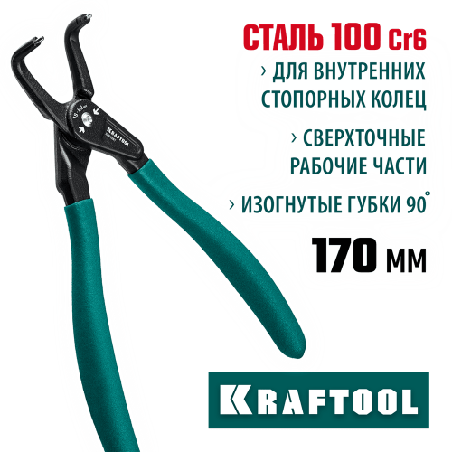 Съемник KRAFTOOL 22812-2, предназначен для монтажа и демонтажа внутренних стопорных колец. Запрессованные наконечники из шарикоподшипниковой стали 100 Cr6. Большая площадь наконечников надежно удерживает стопорное кольцо. Высокоточный шарнир с ходом без люфта. Маслобензостойкие рукоятки с нескользящим покрытием.