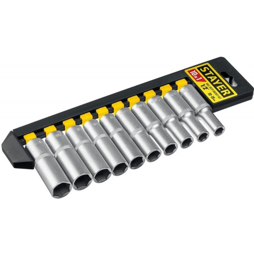 Набор удлиненных торцовых головок (1/2") на пластиковом рельсе STAYER 27756-H10, предназначен для монтажа/демонтажа резьбовых соединений при проведении слесарно-монтажных работ.