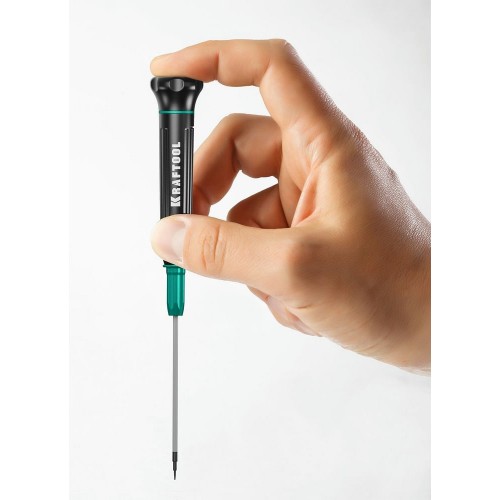 Отвертка для точных работ KRAFTOOL 25682-00, предназначена для выполнения прецизионных работ в электронике и электромеханике. Три зоны вращения: быстрая, точная, силовая. Свободно вращающийся затыльник. Высокоточный наконечник.