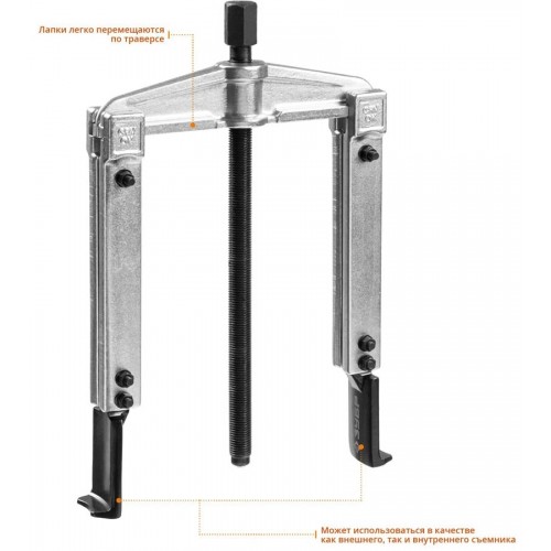 Захваты съемника выкованы из качественной инструментальной стали, что обеспечивает долгий срок службы при работе с высокими нагрузками. Позволяет работать с широким рядом узлов. Уменьшенные по толщине захваты дают возможность работать в условиях ограниченного пространства.
