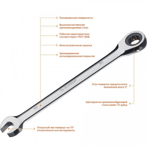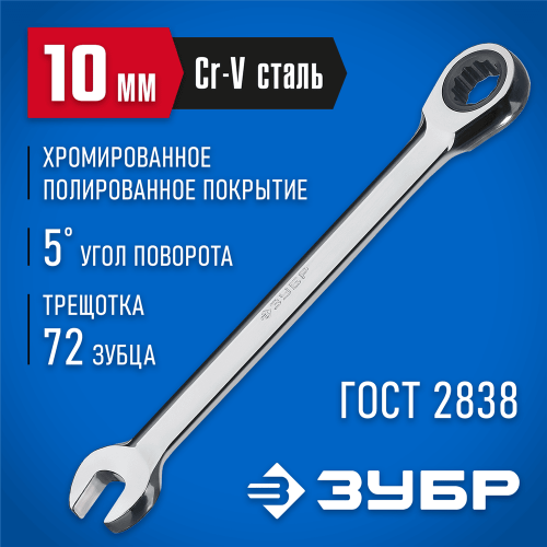 ЗУБР 10 мм, комбинированный гаечный ключ трещоточный 27074-10_z01