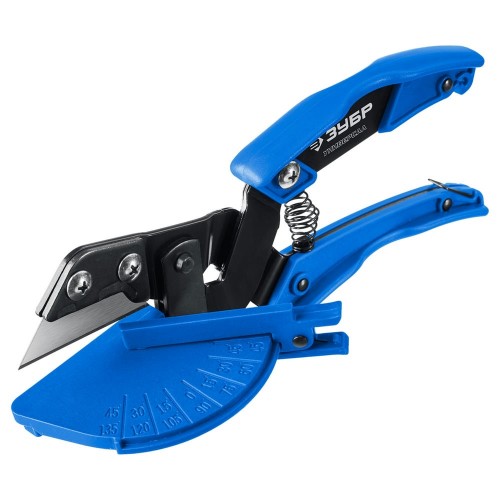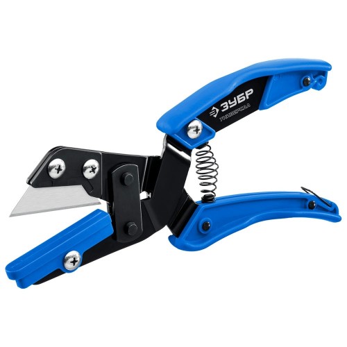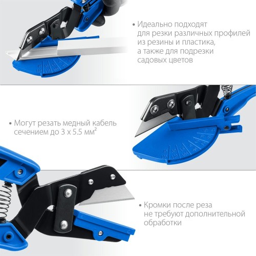 Ножницы ЗУБР 23371 предназначены для резки пластиковых профилей разнообразной формы. Универсальный (незаменимый) инструмент для чистого реза теперь со сменным лезвием. Идеально справляется с резкой различных профилей из резины и пластика, поможет бережно подрезать садовые цветы. Ножницы способны резать даже медный кабель сечением до 3х5,5 мм². Сменная площадка для резки под различными углами уже в комплекте. Чистый рез без замятия и заусенцев. Кромки не требуют дополнительной обработки. Стандартное сменное лезвие (трапеция тип А24) значительно продлевает срок службы инструмента. Удобная площадка для резки под различными углами (идет в комплекте) значительно расширяет возможности использования инструмента. Корпус из листовой 3мм стали выдеживает большие нагрузки. Эргономичная рукоятка сделанна из бензо-маслостойкого пластика. Подходит для работы в тяжелых условиях. Удобная система фиксации рукояток в закрытом положении повышает безопасность при хранении инструмента. Материал лезвия - У8А.