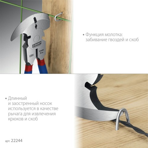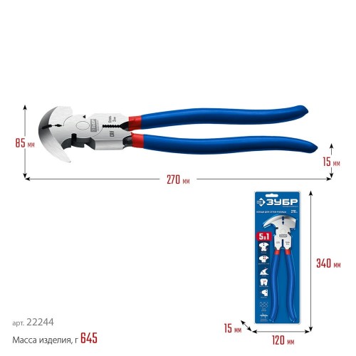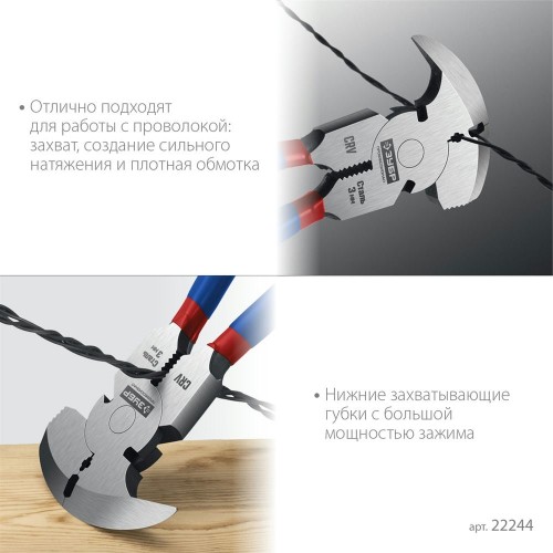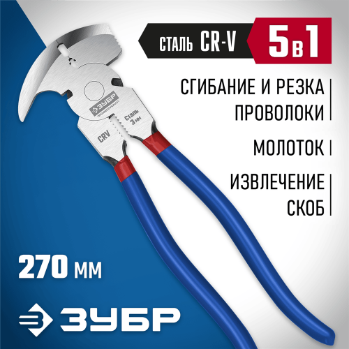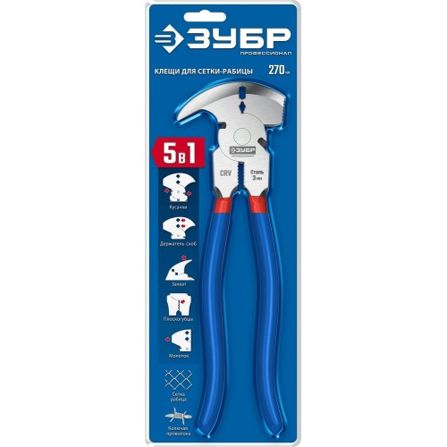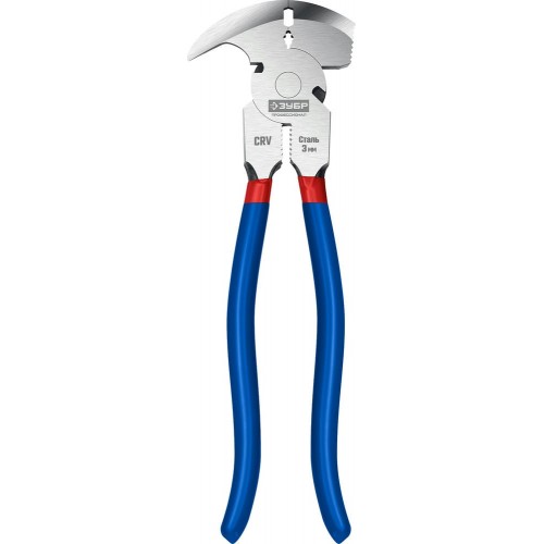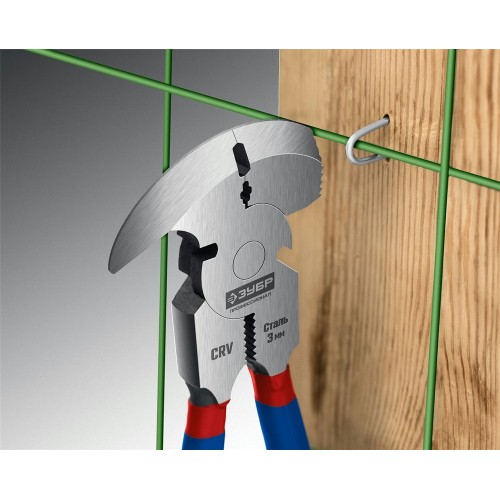 Клещи для сетки рабицы ЗУБР 22244, предназначены для установки сетки-рабицы. Многофункциональный инструмент: функции откусывания, сгибания и удержания проволоки, молоток, выдергивание крюков. Удобные рукоятки.