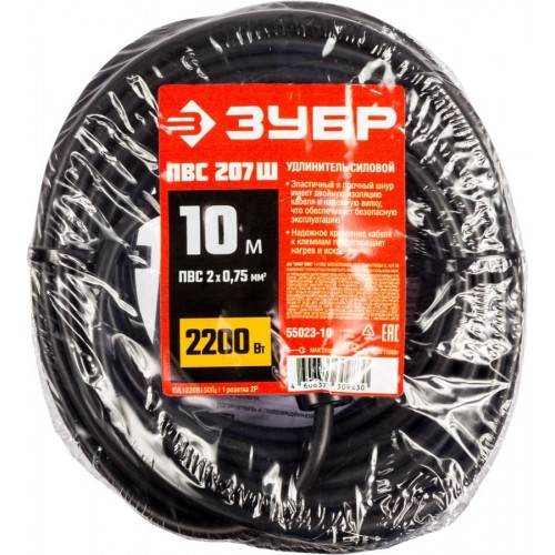 Удлинитель-шнур 55023-10, предназначен для подключения электрических приборов, которые находится на удалении от основного источника сети. Состоит из провода типа ПВС черного цвета и одной розетки. Облегчит работу на приусадебном участке, стройке или в быту. Эластичный и прочный соединительный шнур имеет двойную изоляцию кабеля и надежную вилку, что обеспечивает безопасную эксплуатацию Надежное крепление кабеля к клеммам, предотвращает нагрев и искрение для подключения электрических приборов к сети. Суммарная мощность одновременно подключаемых приборов не должна превышать 2200 Вт.