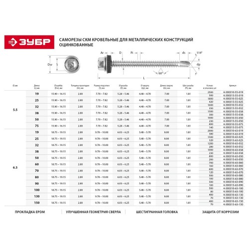 Кровельные саморезы изготовлены из стального прутка с высоким содержанием углерода. Контроль за геометрией самореза начинается с калибровки прутка и заканчивается тщательной проверкой размеров готового изделия. Нормативная твердость стали достигается термической обработкой. Поверхностная твердость мин. 560HV, твердость в сердцевине 240-425HV. Шайба с прокладкой EPDM плотно прижимается к кровельному материалу, герметизируя просверленное отверстие. Шестигранная головка выдерживает большой крутящий момент и значительно облегчает вкручивание самореза. Геометрические размеры: диаметр шайбы (Dw) - 13.90-14.15мм, толщина прокладки (Ar) - 2мм, Размер под ключ (S) - 7.8-7.9мм, диаметр резьбы (D) - 4.75-4.95мм, диаметр сверла (dp) - 2.8-2.9мм, длина сверла (ds) - 4.0-4.8мм, шаг резьбы (Pi) - 2.12мм.