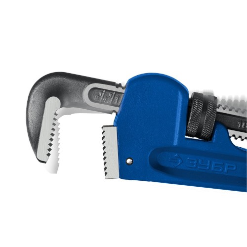 Ключ трубный ЗУБР 27339-1_z02, предназначен для профессионального применения в сантехнических и слесарных работах, машиностроении и автомобильной промышленности, для захвата деталей различного поперечного сечения при проведении работ с применением значительных усилий. Губки изготовлены из высококачественной хромованадиевой (CrV) стали. Для увеличения износостойкости зубцы подвергнуты индукционной закалке токами высокой частоты до твердости 53 – 59 HRC. Цельнолитая конструкция и специальная форма губок позволяют применять инструмент при высоких нагрузках. Угол наклона зубьев обеспечивает максимально возможное усилие захвата. Специальная конструкция подвижной губки обеспечивает самозахват крепежа.