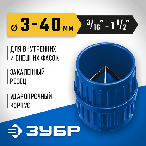 Зенковка-фаскосниматель ЗУБР 23791, предназначена для снятия внутренней и внешней фаски труб. Универсальный внутренний и внешний фаскосниматель для медных, алюминиевых, латунных, бронзовых, металлопластиковых и пластиковых труб. Благодаря высокоточным мультилезвийным ножам, изготовленым из закаленной инструментальной стали, обеспечивает быстрое и точное снятие фаски. Корпус из ударопрочного АБС-пластика.