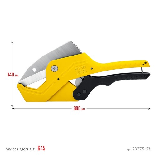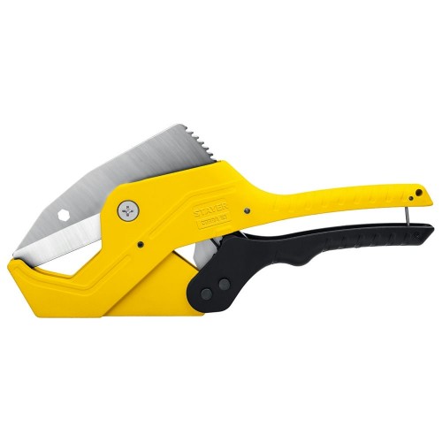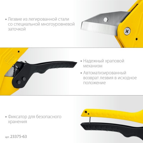 Труборез по металлопластиковым и пластиковым трубам STAYER 23375-63, предназначен для разрезания различного типа пластиковых и металлопластиковых труб при монтаже водопроводных и отопительных систем. Продуманный особо прочный и облегченный корпус из алюминиевого сплава. Специальная многоуровневая заточка лезвия дольше сохраняет остроту и выдерживает высокие нагрузки. Надежный храповой механизм увеличивает мощность реза и минимизирует прилагаемые усилия. Автоматизированный возврат лезвия в исходное положение отжатием нижней рукоятки для удобной работы одной рукой. Лезвие из легированной стали с твердостью 55–58 HRC. Стальной механизм фиксирования рукояток в сложенном виде для безопасного хранения инструмента.