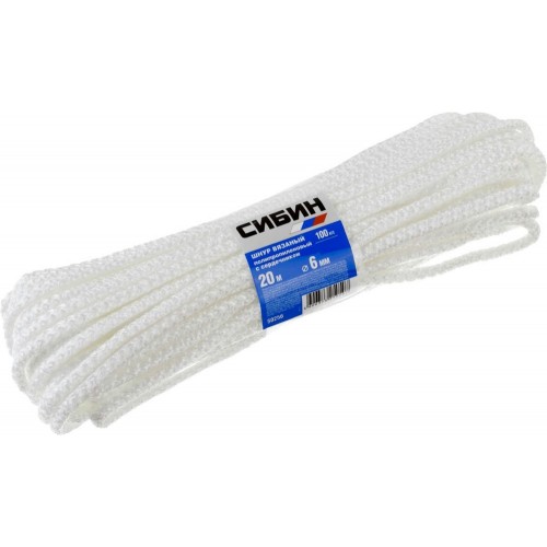 Шнур вязаный полипропиленовый с сердечником СИБИН 50256, предназначен для хозяйственно-бытового применения. Полипропиленовые шнуры имеют легкий вес, плавают в воде, не теряют прочности при намокании. Не усаживаются в мокром виде и не подвержены гниению. Характеризуются отличной устойчивостью к климатическим влияниям, кислотам, щелочам и растворителям, хорошей устойчивостью к УФ-излучению.