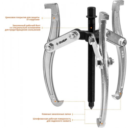 Захваты съемника выкованы из качественной инструментальной стали, что обеспечивает долгий срок службы при работе с высокими нагрузками. Позволяет работать с широким рядом узлов