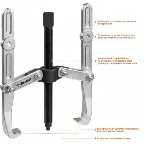 Захваты съемника выкованы из качественной инструментальной стали, что обеспечивает долгий срок службы при работе с высокими нагрузками. Позволяет работать с широким рядом узлов