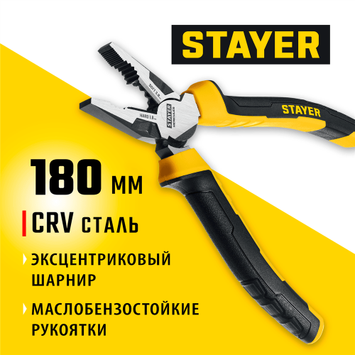 Плоскогубцы STAYER 2203-1-18_z03, предназначены для выполнения слесарных, монтажных и ремонтных работ, широко используются в промышленности, транспорте, автосервисах и в личных гаражах и мастерских для захвата и удерживания мелких предметов, перекусывания проволоки. Эксцентриковый шарнир увеличивает передаваемое усилие. Изготовлены из высокопрочной Cr-V стали. Закаленные рабочие поверхности. Маслобензостойкие рукоятки.