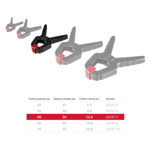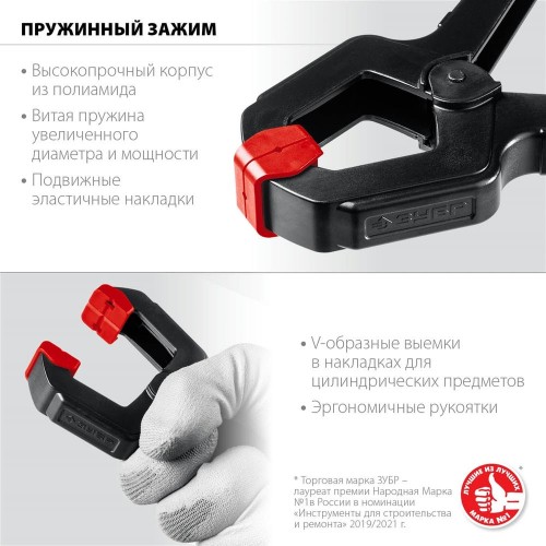 Пружинный зажим ЗУБР 32247-7, предназначен для прочной фиксации и плотного контакта деталей в процессе обработки или склеивания. Конструктивно простое приспособление, необходимое в быту и производственной сфере.