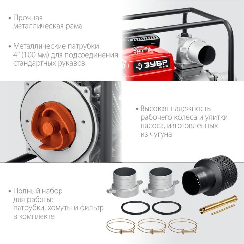 Мотопомпа бензиновая ЗУБР МП-1600, предназначена для откачки (перекачки) воды из водоемов, подвалов, котлованов, емкостей и т.п. Быстро и уверенно справится с масштабными работами по перекачке чистой или слабозагрязненной воды. Применяется в строительных вспомогательных работах, отлично подойдет для небольших сельских хозяйств. Экологичный, экономичный 4-х тактный двигатель ЗУБР гарантирует безотказность работы. Металлические патрубки для присоединения шлангов входят в комплект.Высокая надежность рабочего колеса и улиты насоса, изготовленных из чугуна с добавлением сфероидального графита. Позволяет проводить работы на участках с большим перепадом высот и откачивать воду из бассейнов. Усиленная рама делает оборудование пригодным к использованию в жестких условиях стройки.