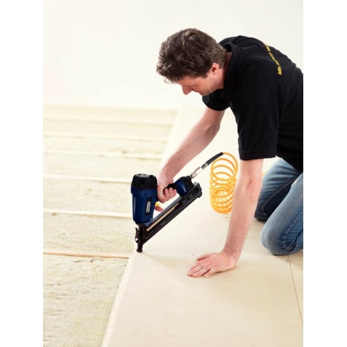 Пистолет гвоздезабивной (нейлер) RAPID 5000104, предназначен для работы по устройству паркетных полов, ремонту балконов и террас, работе с мебелью. Он способен забивать штифты длиной до 64 мм, имеет прочный и прочный легкий корпус из магнииевого сплава, его магазин с наклоном 34° обеспечивает отличный доступ, а регулируемый на 360° выпуск воздуха позволяет отвести пыль от рабочих поверхностей. Другие особенности инструмента - регулируемая глубина забивания, системы быстрой зарядки расходных материалов, удобная рукоятка для меньшей усталости пользователя, простой и понятный механизм для быстрого и легкого устранения застреваний. Подложка для защиты рабочих поверхностей от царапин.