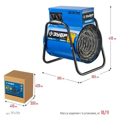 Электрическая тепловая пушка ЗУБР ТП-П9 Профессионал, предназначена для быстрого и направленного обогрева складских и производственных помещений, ангаров и мастерских, благодаря большой площади нагревательных элементов и мощным двигателем вентилятора. Надёжная доработанная конструкция обеспечивает защиту как пользователя, так и тепловой пушки в случае возникновения нештатных ситуаций. Высокоэффективный трубчатый ТЭН из нержавеющей стали исключает сильный нагрев, благодаря чему не перегорает и пожаробезопасен, не выжигает кислород в помещении. Плавная регулировка обеспечивает установку комфортной температуры по желанию. Термопредохранитель предотвращает повреждение изделия и окружающих предметов при нештатной работе.Габариты и вес в упаковке: