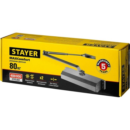 Доводчик дверной STAYER 37916-50, предназначен для автоматического закрывания дверей различного типа. Максимальный вес двери - 80 кг. Подходит для установки на правые и левые двери. Двухступенчатая регулировка скорости закрытия двери. Применение специальной морозоустойчивой жидкости позволяет использовать доводчик при отрицательных температурах вне помещений. Увеличенный ресурс работы - 400000 циклов.