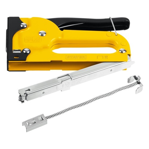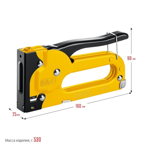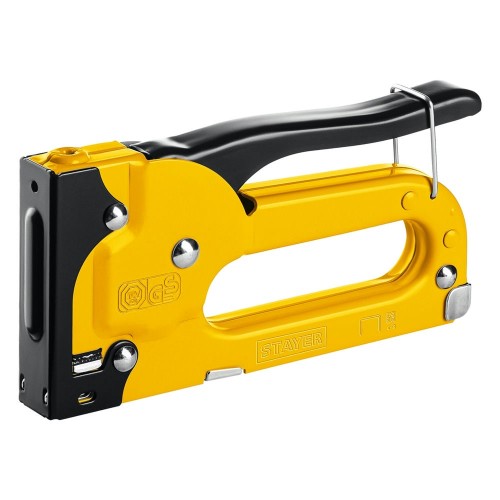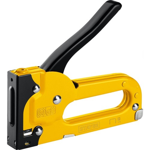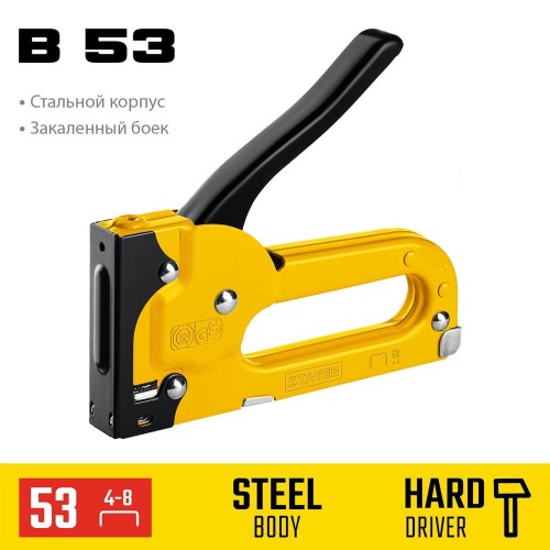 Степлер стальной STAYER B-53 3145_z02, предназначен для крепления тканных и легких материалов с помощью тонких скоб. Боек из закаленной инструментальной стали. Загрузка скоб сзади. Имеется удобная фиксация рукоятки при хранении.