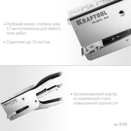 Плайер стальной KRAFTOOL HD-24 3124, предназначен для сшивания листовых материалов. Мощный хромированный цельностальной корпус для долговечной работы. Рукоятка специальной формы. Глубокий захват - глубина зева 57 мм. Простая загрузка скоб сзади.