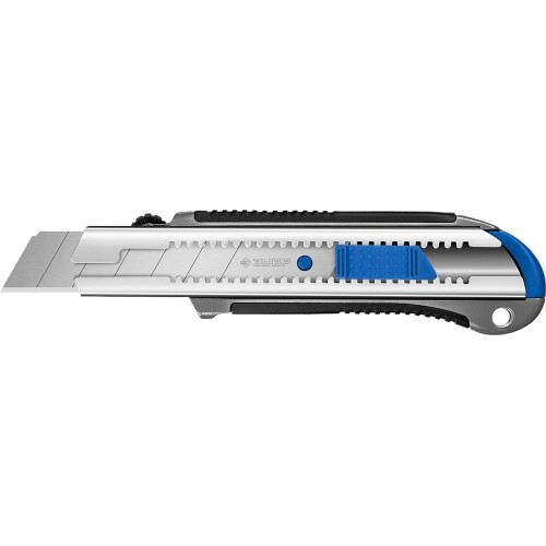 Нож с лезвием ЗУБР 09180, применяется для эффективного разрезания различных материалов: линолеума, ковровых покрытий, гипсолитовых плит, гипсокартона, кровельных материалов, пластика, дерева. Прочный металлический корпус позволяет прикладывать значительные усилия при резе. Автоматический фиксатор лезвия для удобства работы. Дополнительный винтовоой фиксатор для более надежного крепления лезвия при работе с большими усилиями. Лезвие изготовлено из легированной стали У8А с двойной заточкой.