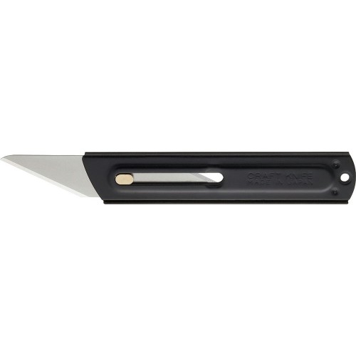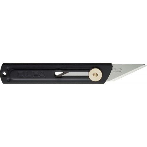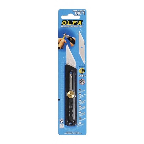 Нож OLFA CK-1 — универсальный инструмент для резки бумаги, картона, резьбы по дереву и выполнения других хозяйственных работ. Усиленный резак со сменным убирающимся лезвием имеет металлический корпус черного цвета и винтовой фиксатор для крепления лезвия. Форма двустороннего лезвия СКВ-1 разработана специально для OLFA CK-1. Размер лезвия составляет 18 х 89 мм, толщина 1.0 мм и длина режущей части 30 мм. Отверстие в корпусе служит для подвешивания ножа на шнурок. Незаменим в домашнем хозяйстве, в мастерской, на рыбалке, в туристических походах и для автомобилистов.
