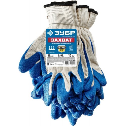 Нитриловые перчатки ЗУБР 11457-K10, предназначены для защиты рук от истирания при выполнении хозяйственных работ. Текстурированное покрытие обеспечивает лучшее сцепление с поверхностью. Нитриловое покрытие обладает маслобензостойкостью. Гипоаллергенные.